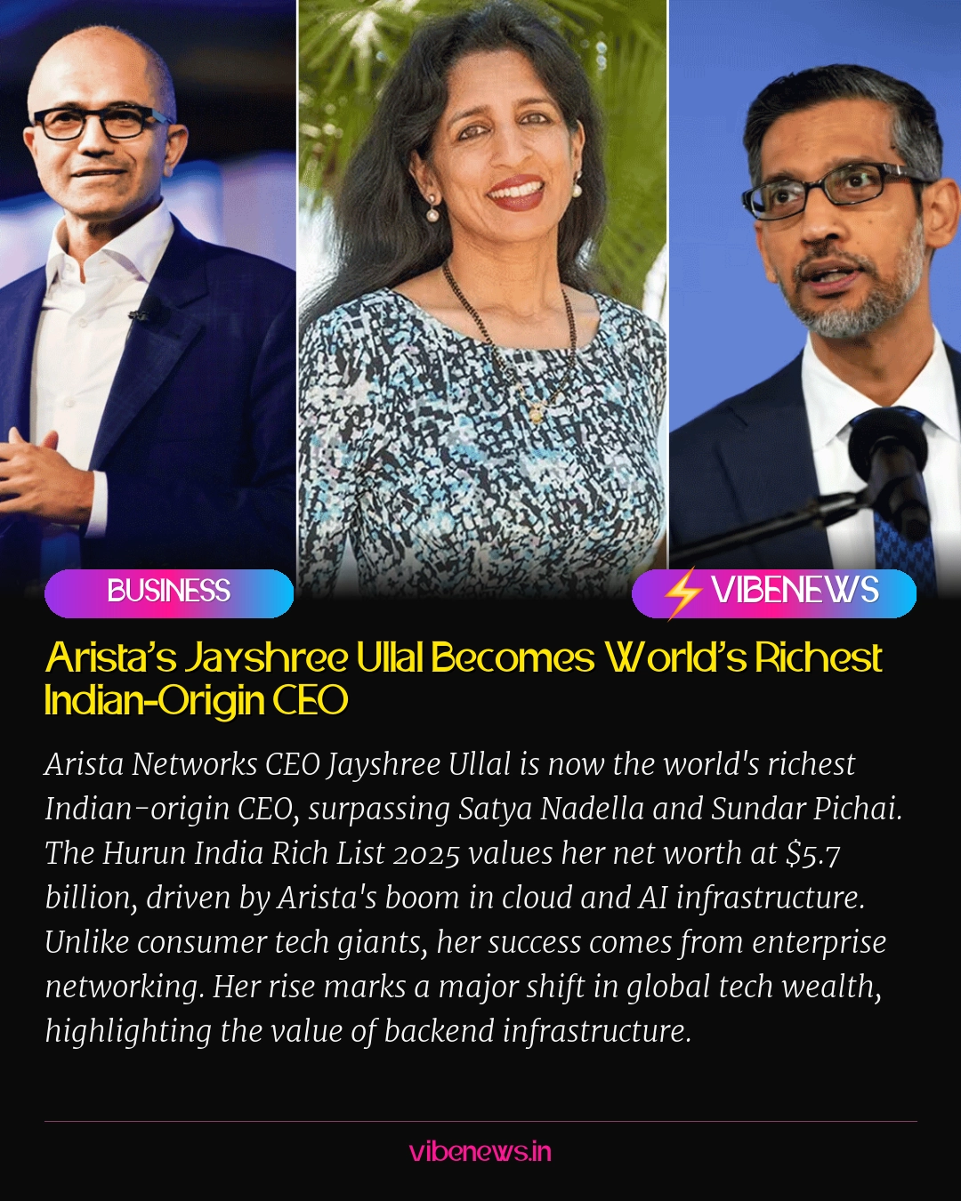 In a stunning shift at the top of the global tech hierarchy, Jayshree Ullal has emerged as the wealthiest Indian-origin CEO in the world. According to the Hurun India Rich List 2025, the Arista Networks President and CEO now commands a net worth of $5.7 billion, quietly leapfrogging household names like Microsoft's Satya Nadella and Google's Sundar Pichai.
