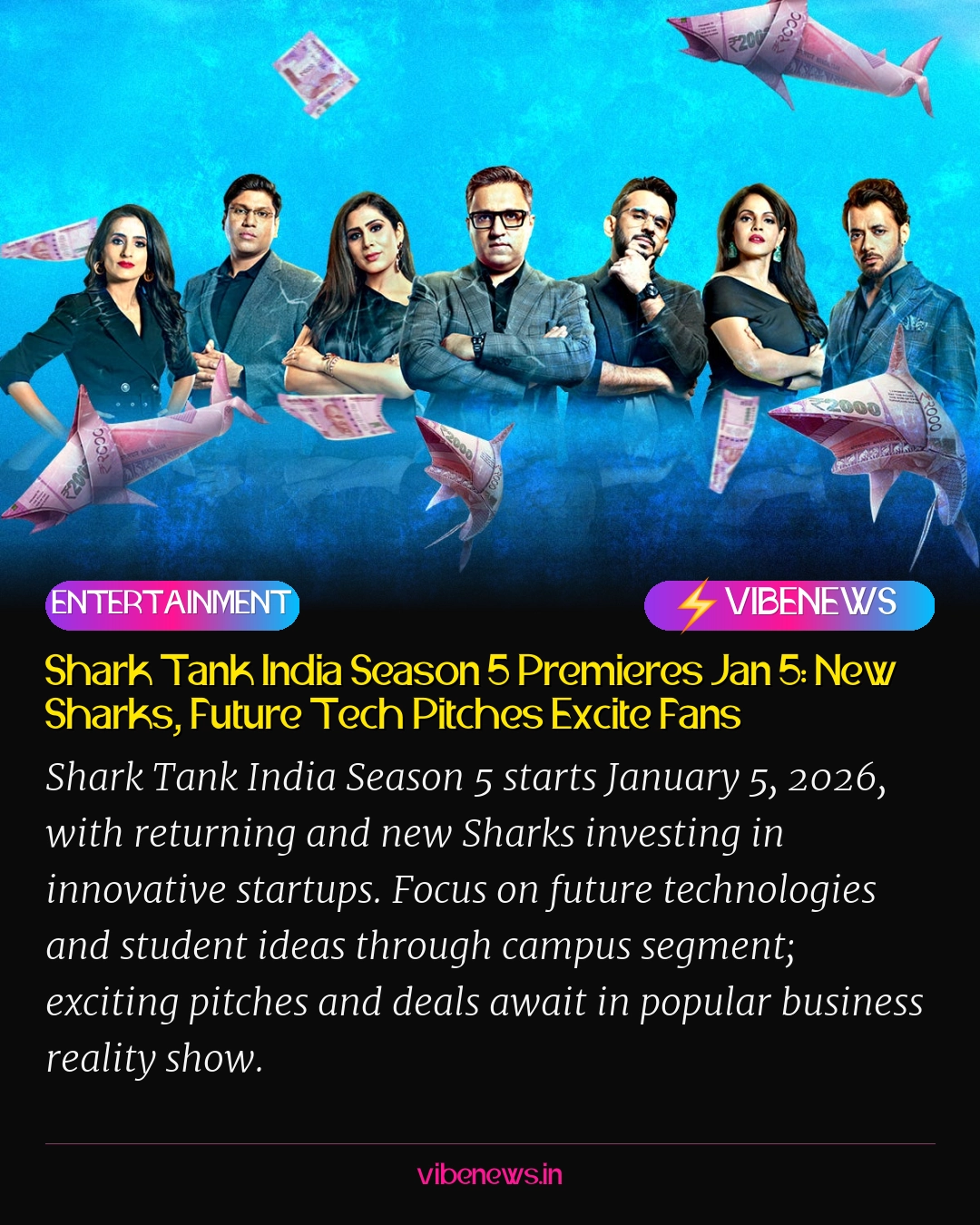 Shark Tank India returns for Season 5 on January 5, bringing fresh energy with a mix of familiar Sharks and new faces ready to back India's next big ideas. The season emphasises future-forward technologies, sustainability, and a special campus segment showcasing student entrepreneurs. Expect emotional founder stories, tough negotiations, and game-changing deals as Sharks compete for promising ventures. From AI solutions to eco-friendly products, pitches reflect the vibrant startup boom.