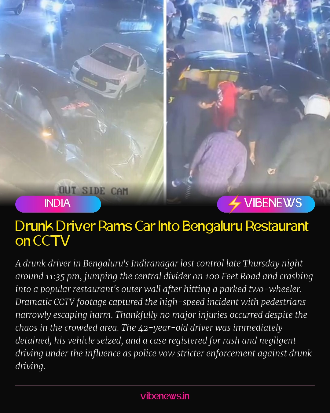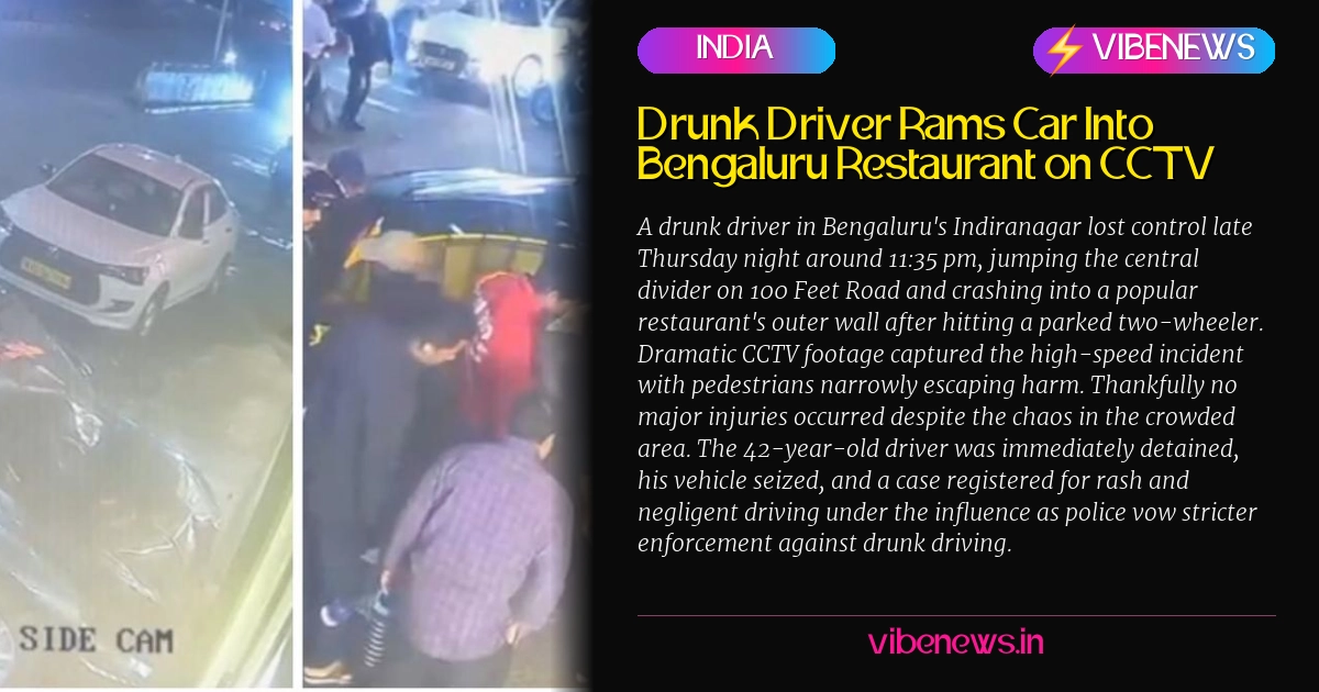 Late-night road accidents always hit close to home for me, reminding how one reckless decision can shatter lives in seconds—this Bengaluru crash was terrifyingly close. Around 11:35 pm Thursday on bustling 100 Feet Road Indiranagar, a 42-year-old intoxicated driver failed a left turn, leaped the divider at speed, struck a parked scooter, and slammed into a restaurant wall. CCTV shows people scattering just in time—miraculous no serious injuries amid debris panic.