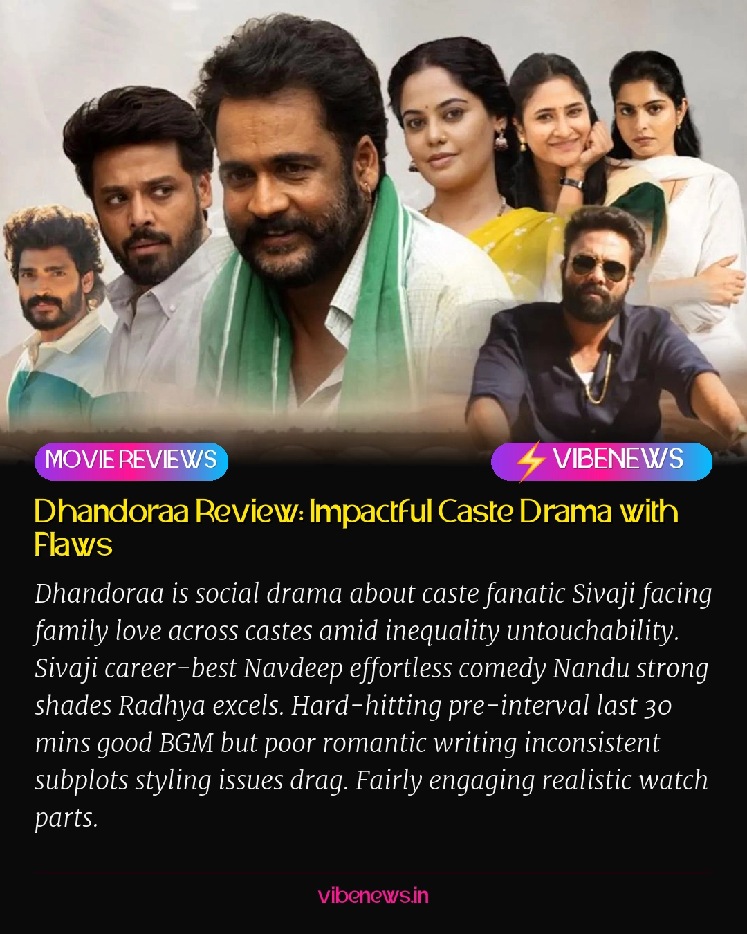 Social dramas tackling caste hit hard when done right reminding me of real inequalities I've read about—this Dhandoraa packs punch inconsistently. Sivaji as rigid village head opposing inter-caste loves in family delivers arguably career-best—at least four scenes gave chills. Navdeep natural sarpanch comedy timing spot-on emotional climax. Nandu multi-layered strong especially end Radhya helpless yet powerful. Direction debutant chooses bold theme no sides engaging parts pre-interval shock last 30 emotional payoff solid.