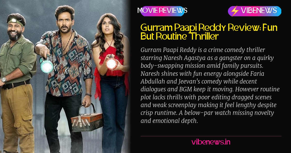 Crime comedies can be hit-or-miss for me—when they nail the balance of laughs and tension they're gold but here Gurram Paapi Reddy felt like a familiar ride with some bumps. Released recently this film puts Naresh Agastya as Paapireddy on a bizarre crematorium mission swapping bodies while dodging a royal family. Naresh steps up nicely out of his usual zone bringing fun vibe that reminded me of those light-hearted gangster flicks I binge on weekends. Faria Abdullah holds screen well Jeevan cracks some laughs and dialogues have sharp one-liners.