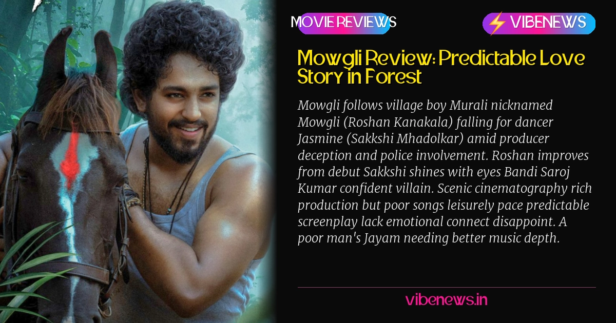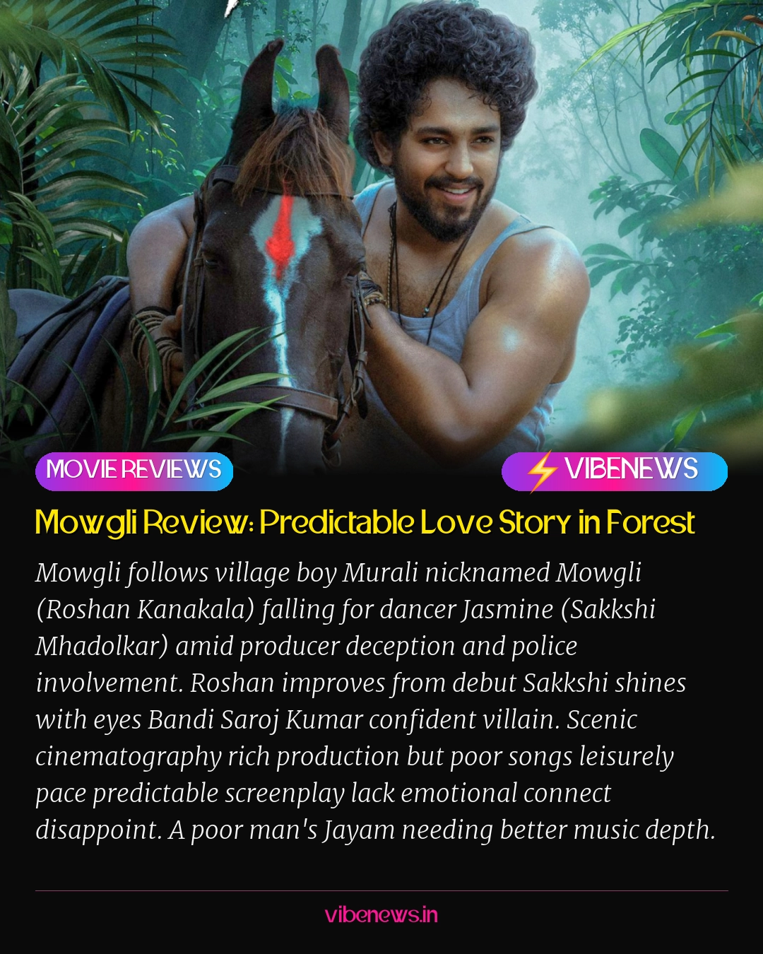 Forest-set love stories always pull me in with their raw romance potential but Mowgli left me wanting more emotional punch. This film has Roshan Kanakala as simple village Mowgli smitten by city dancer Varsha (Sakkshi Mhadolkar) complicated by shady producer and cop Christopher Nolan (fun name!). Roshan eases into romance action better than debut though emotions need polish—his comfort reminded me of early hero journeys. Sakkshi's expressive eyes steal scenes Bandi Saroj confident antagonist Harsha Chemudu handles comedy-emotion well even Suhas cameo works.