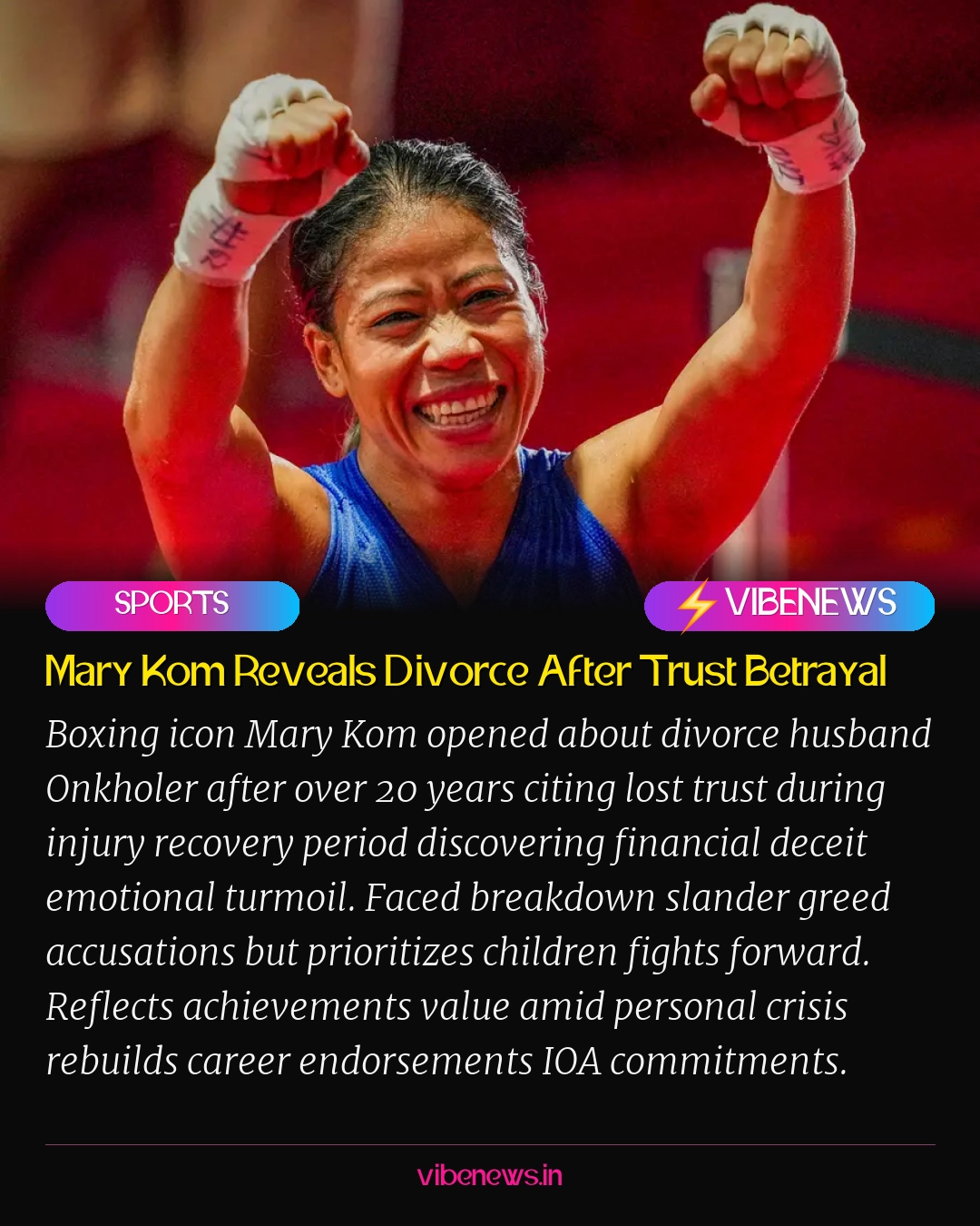 Legends personal struggles humanize them—Mary Kom's raw divorce disclosure broke my heart yet inspired. Six-time world champ separated years divorced quietly 2023 after attempts failed. Bedridden injury pre-2022 CWG exposed husband's lies cheating crores land loans.