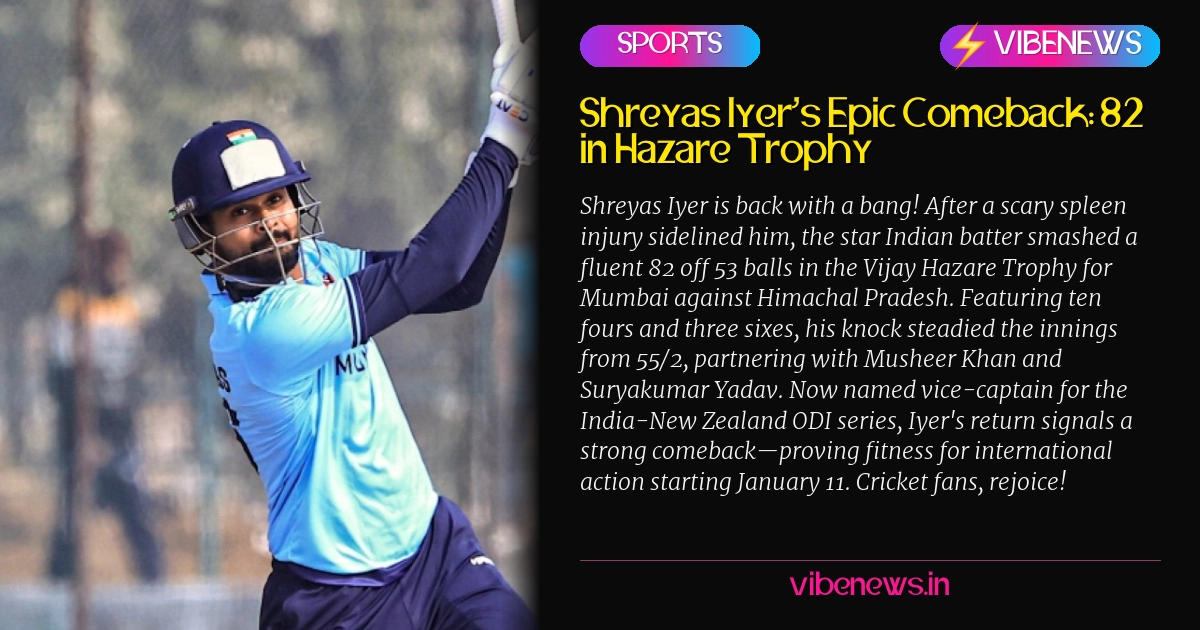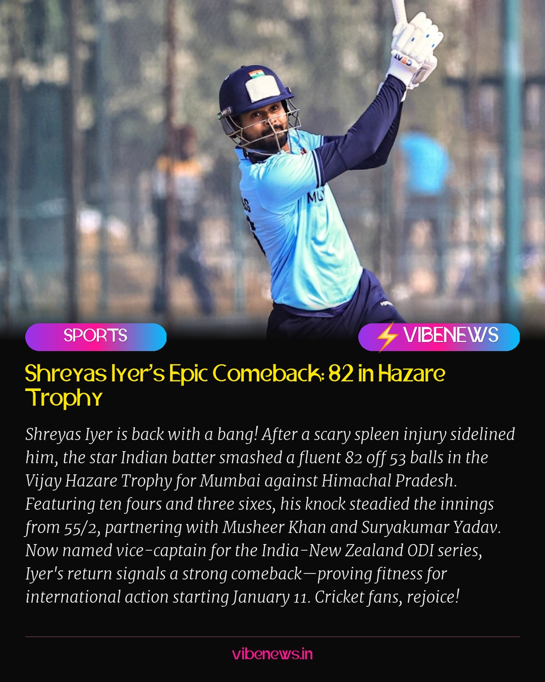 - Shreyas Iyer scored 82 runs off 53 balls, including ten fours and three sixes, in the Vijay Hazare Trophy match against Himachal Pradesh on January 6, 2026, at Jaipuria Vidhyalaya Ground in Jaipur.